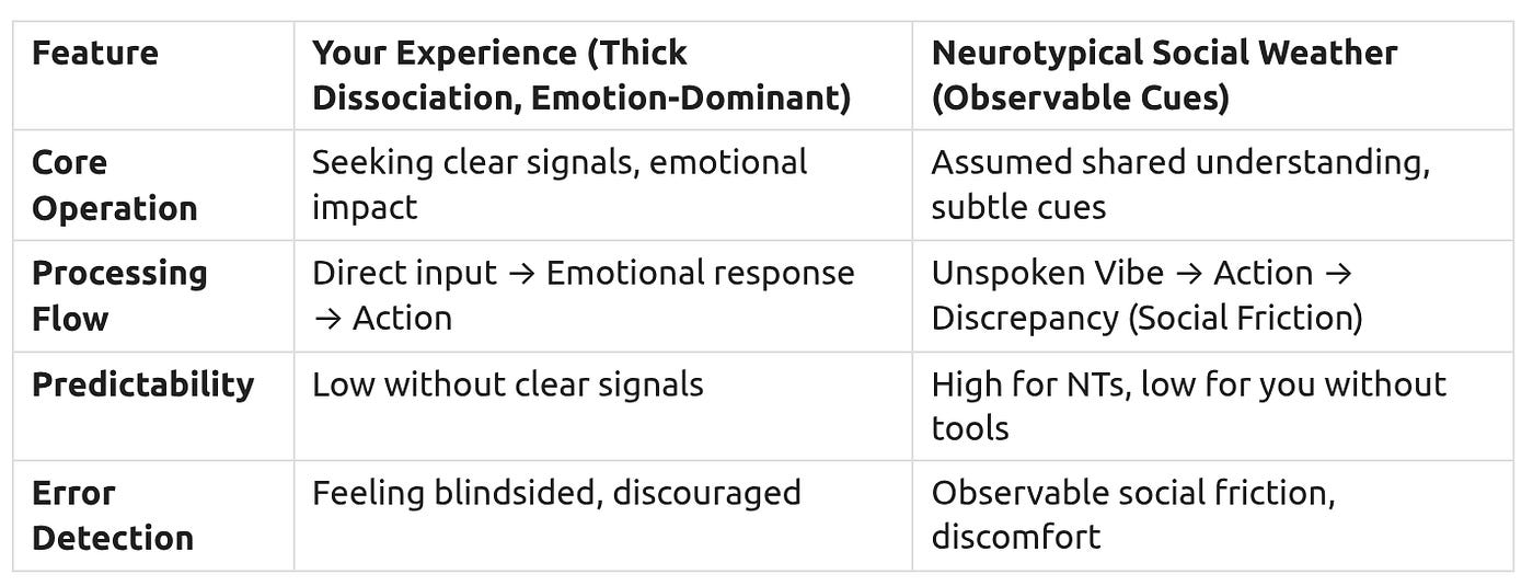 This document is crafted for individuals who experience the world with a thick dissociation layer, meaning the inner workings of their mind are not always clear, and who navigate social situations with a dominant emotional temperament. If you often feel “blindsided” by unexpected social shifts, find neurotypical communication confusing, or become easily discouraged by social challenges, this guide is for you.