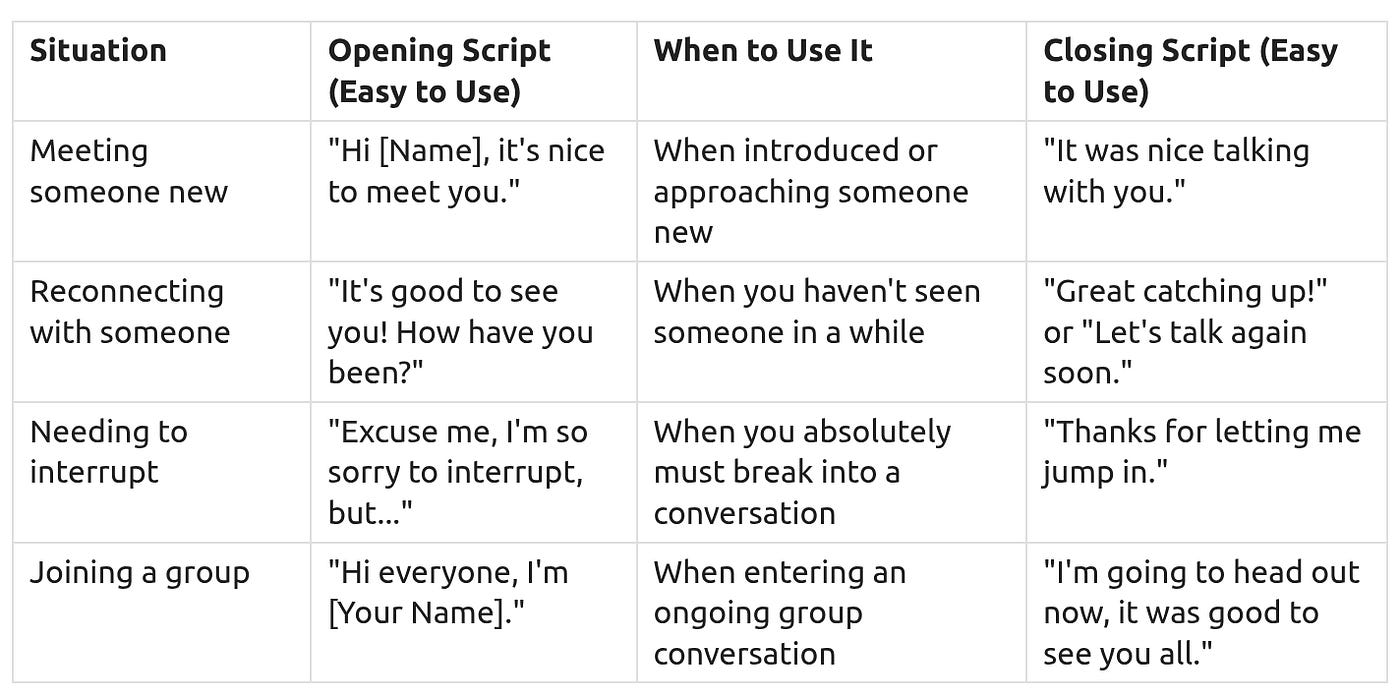 Function: These are simple, reliable social scripts designed to initiate and maintain basic social connections. Think of them as ”Social Handshakes”— small, predictable exchanges that signal your willingness to engage without requiring complex emotional interpretation. The goal is to reduce anxiety and prevent feeling blindsided by unexpected social cues.