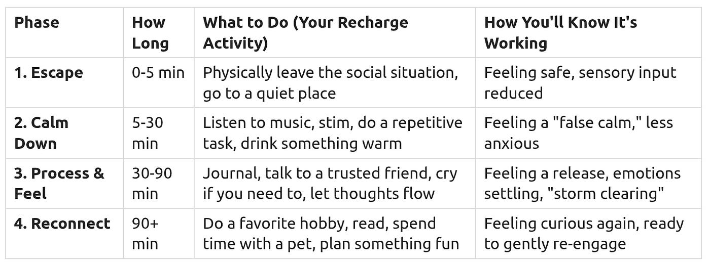 After social interactions, especially difficult ones, it’s essential to have a Personal Recharge Station — a set of activities that help you recover and feel like yourself again. Skipping these steps leads to cumulative stress and makes future interactions harder.