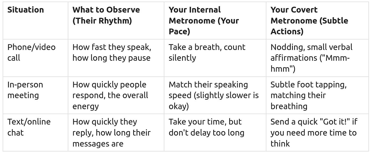 Important: Your metronome should be subtle. The goal is to feel more comfortable and in sync, not to mimic perfectly. A slight delay in your response can even signal thoughtfulness.