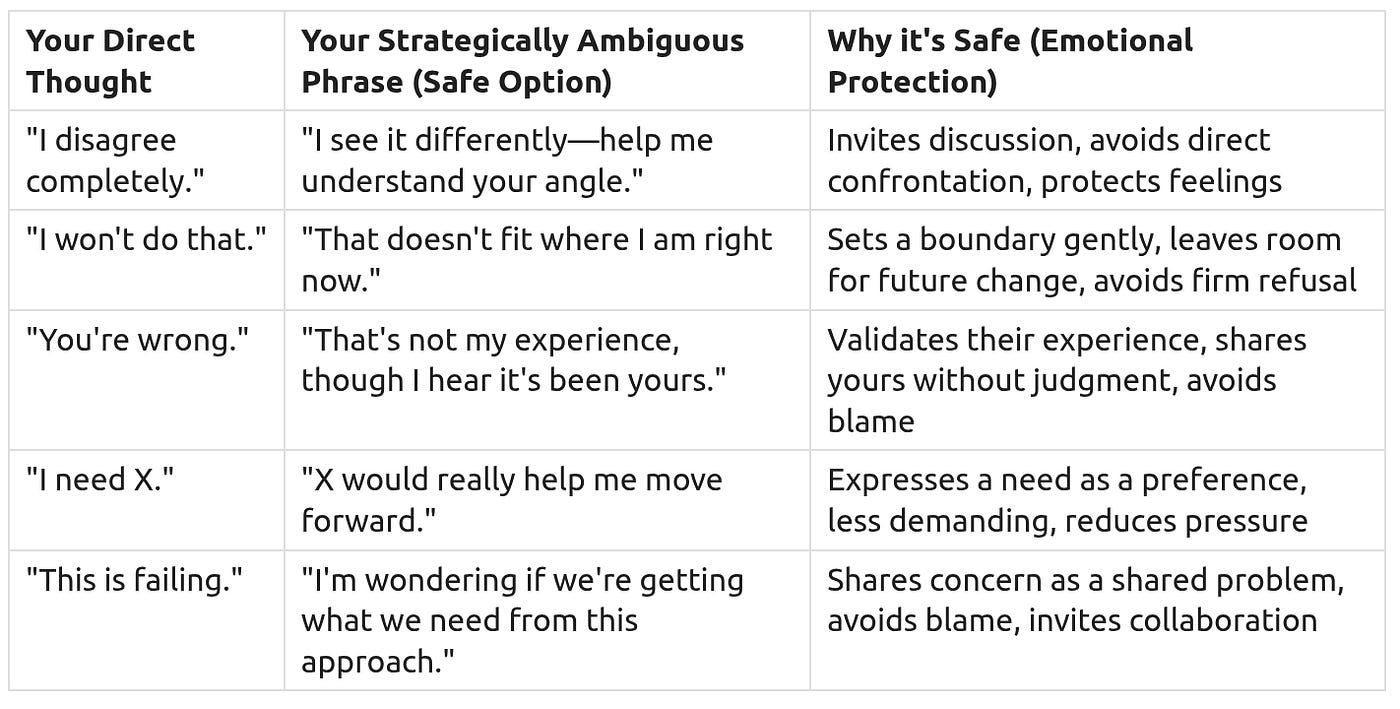 Sometimes, being too direct or too clear can cause more problems than it solves in social situations. Strategic Ambiguity means using phrases that are a little vague, allowing for flexibility and avoiding unnecessary conflict. This is a tool for emotional self-preservation.