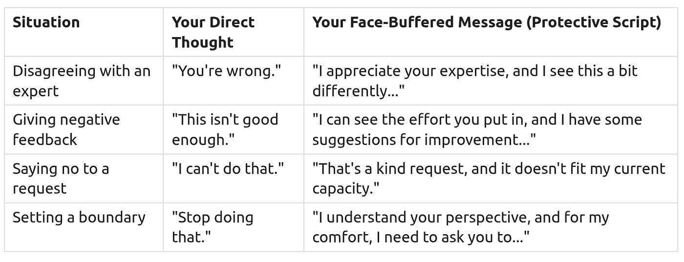 Sometimes you need to say something that might be difficult for others to hear. The Face-Buffer Protocol is like a cushion that softens the message, protecting both their feelings and your own. It helps prevent social shocks and discouragement.