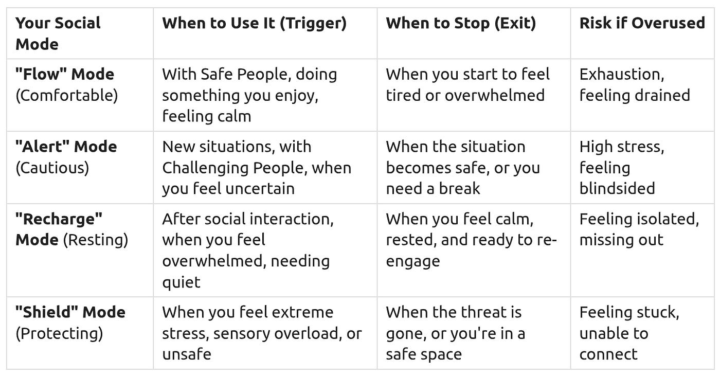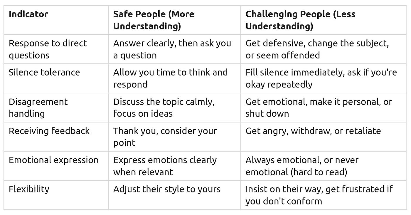 Not all social interactions are equally draining. Some people are easier to be around than others. This section helps you identify Safe People — those who are more understanding and less likely to cause social shocks. Prioritize your energy for these interactions.