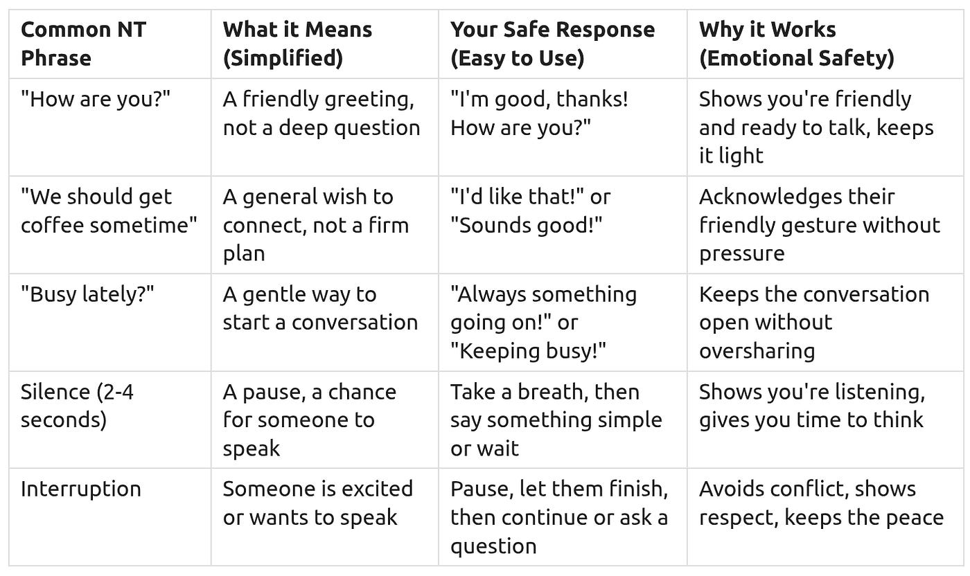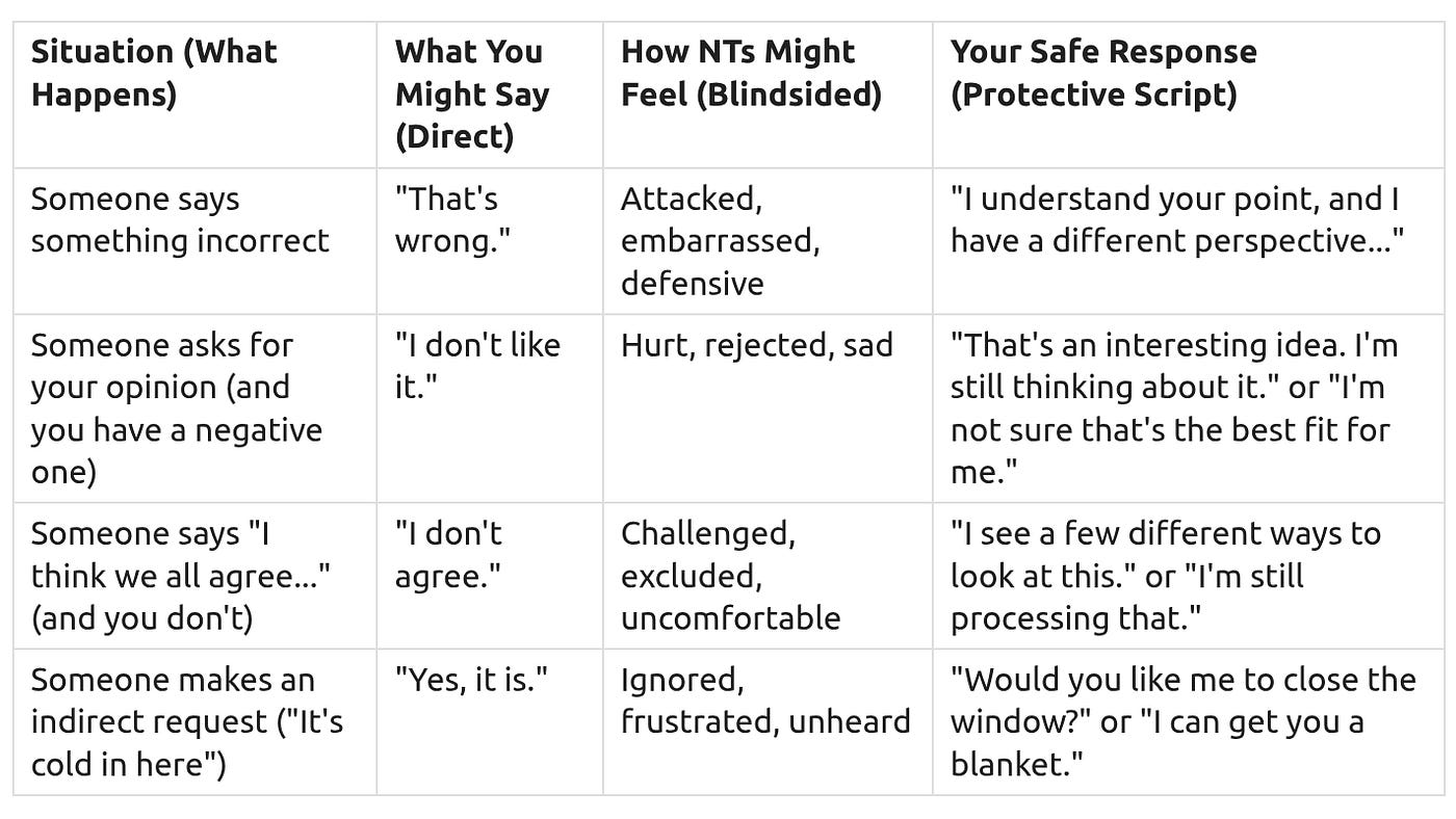 Neurotypical communication often prioritizes social comfort over direct truth. This means people might say things indirectly or avoid direct criticism to keep everyone feeling good. When you speak directly, it can sometimes feel like a “social shock” to others, even if you don’t mean it that way. This sections helps you avoid these shocks and protect your own emotional well-being.