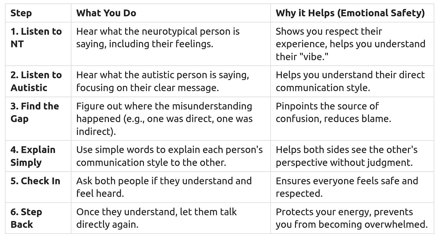 Sometimes, you might find yourself in a position to help neurotypical people understand autistic communication, or vice versa. This is a special role, like being a Social Navigator or a Bridge-Builder. It takes a lot of energy, so use it wisely and only when you feel safe and able.