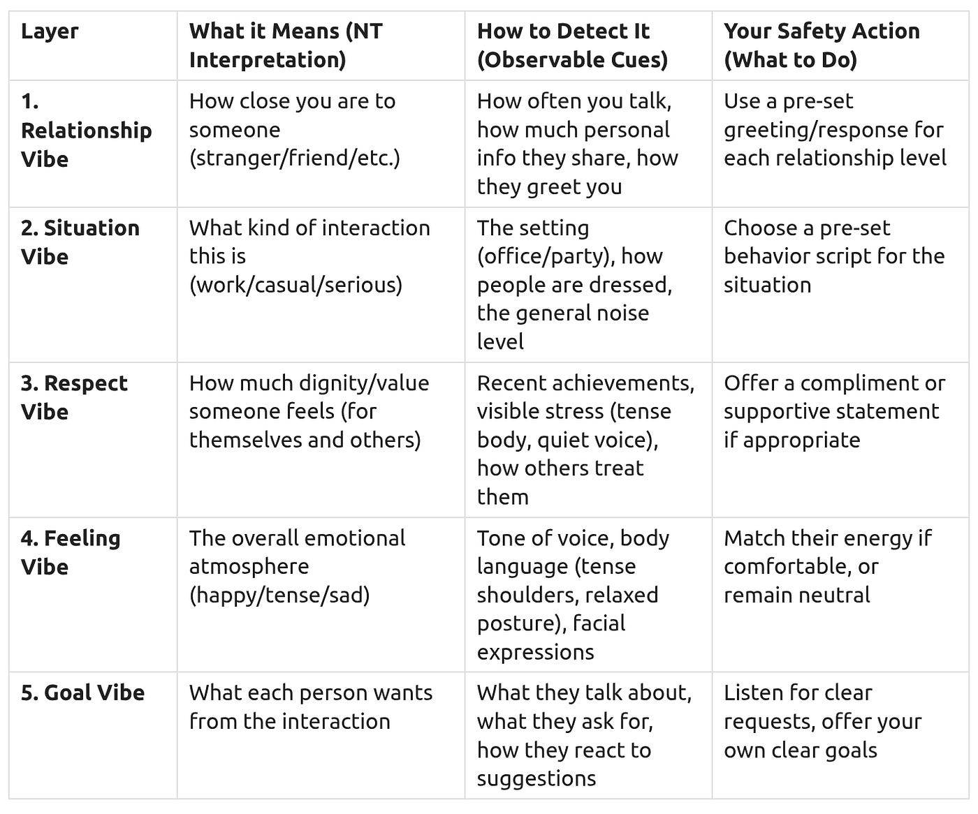 Neurotypical people constantly send out small, often unconscious, signals about how they are feeling and what they expect. For someone with a thick dissociation layer, these can be hard to notice. This section focuses on simple, observable signals that can help you “read the room” and feel more secure.
